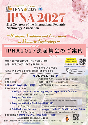 第21回国際小児腎臓学会(2027年3月9日~13日、於:国立京都国際会館)の開催に向けて、ご関係者の皆様と目標を共有し準備体制を強化するため、下記の通り決起集会を開催する運びとなりました。